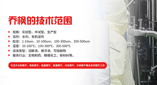 上海喬楓實業有限公司,成立于2012年,是從事噴霧干燥設備的研發設計、生產、銷售(小型噴霧干燥機,實驗型噴霧干燥機,35℃低溫噴霧干燥機,有機溶劑噴霧干燥機,低溫閉式循環噴霧干燥機超細粉末噴霧干燥機、噴霧冷凍干燥機真空噴霧干燥機、氣流噴霧干燥機,噴霧造粒干燥機離心噴霧干燥機,沸騰制粒機等)和售后于一體的綜合性公司,本公司現成為一家致力于為生物制藥、精細化工、新能源、陶瓷造粒及食品工程等領域提供全套解決方案的整線交鑰匙工程企業。
